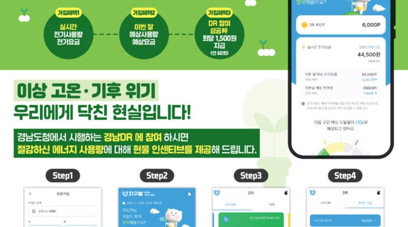참여를 희망하는 도민은 경남DR 앱 서비스 운영업체인 헤리트의 ‘에첼’ 또는 에너넷의 ‘지구방’ 모바일 앱을 통해 간편하게 가입할 수 있다. 해당 앱에서는 실시간 전기사용량과 예상 요금 확인은 물론, 사용 패턴 분석과 절감 실적에 따른 인센티브 내역 등을 확인할 수 있다.