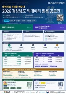 경상남도 빅데이터센터는 도민 생활 속 불편을 해결하고 데이터 기반 정책 아이디어와 혁신 창업 모델을 발굴하기 위해 ‘2026년 경상남도 빅데이터 활용 공모전’을 개최한다.