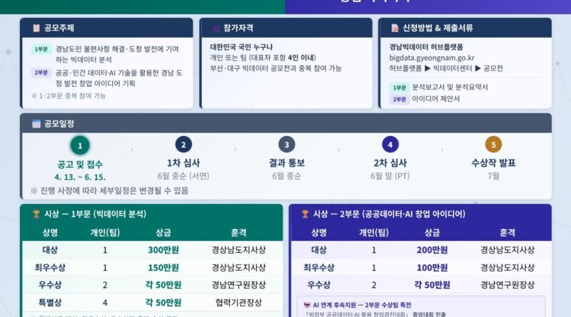 김영애 경상남도 정보통신담당관은 “이번 공모전은 데이터 분석 결과와 인공지능을 활용한 새로운 서비스와 창업 아이디어를 정책 개선에 연결하는 데 의미가 있다”며 “도민과 예비 창업자, 학생, 연구자 등 다양한 참여자들이 데이터를 통해 경남의 변화를 제안하는 장이 되길 기대한다”고 전했다.