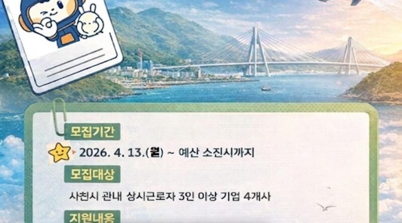 신청 대상은 사천시 소재 상시근로자 3인 이상 기업 및 단체로, 일부 제한업종을 제외한 가운데 4개 기업을 선정될 예정이다.
