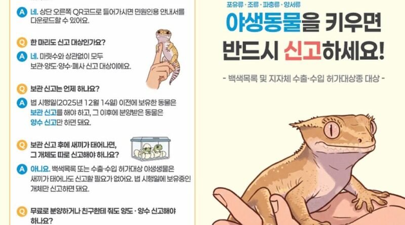이번 제도는 야생동물 관리 체계를 강화하기 위한 것으로, 2025년 12월 14일부터 2026년 12월 13일까지 1년 동안 계도기간을 운영할 계획이다.