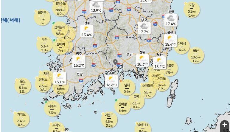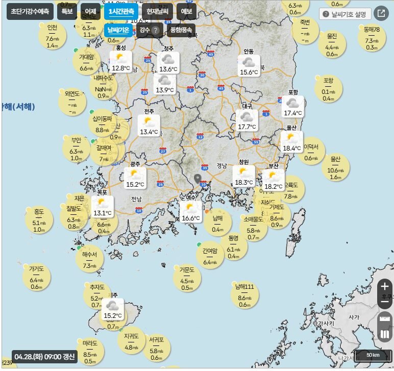 ○ (해상) 오늘(28일) 오전까지 서해중부해상, 오늘 오전부터 내일(29일) 오전 사이 동해중부해상과 제주도해상에는 바람이 30~45km/h(8~13m/s)로 강하게 불고, 물결이 1.0~2.5m로 높게 일겠으니 항해나 조업하는 선박은 유의하기 바랍니다.