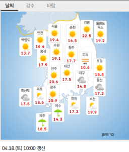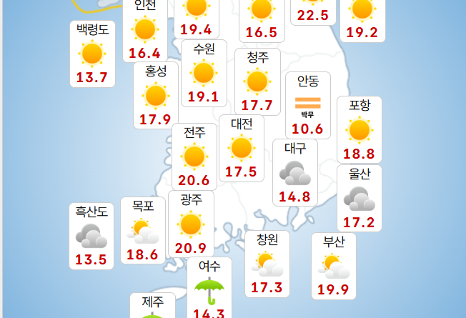 기온은 당분간 평년보다 높은 수준을 유지한다. 18일 낮 최고기온은 19~27도, 19일은 19~29도까지 오르며 초여름에 가까운 날씨를 보이겠다. 20일은 다소 내려가 17~24도 수준이 예상된다.