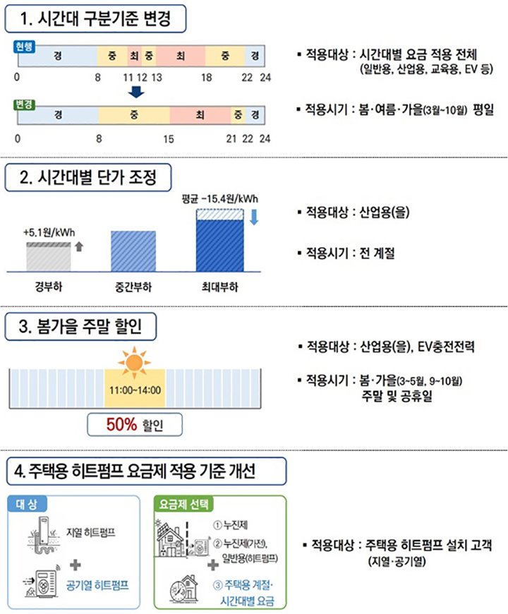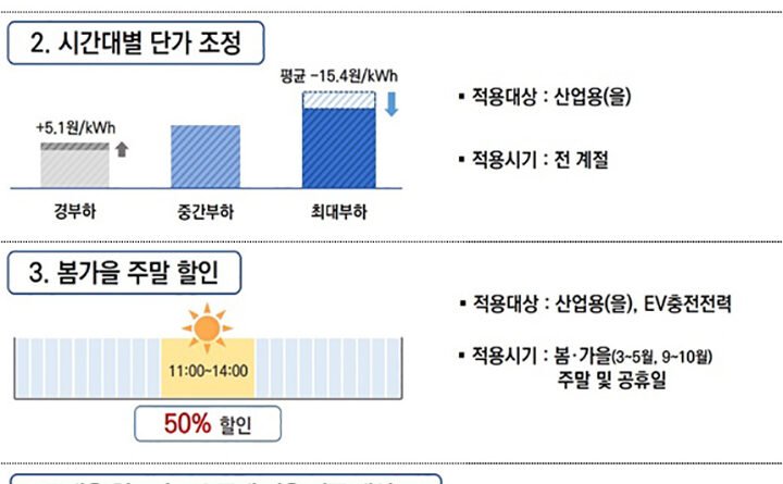 특히 봄과 가을 주말 및 공휴일 낮 시간에는 파격적인 할인 정책이 적용된다. 전력 공급이 상대적으로 풍부한 이 시기에는 전력량 요금의 최대 50%가 할인돼 기업과 소비자 모두 비용 절감 효과를 체감할 수 있을 전망이다.