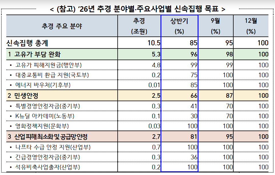 이번 조치는 2월 말 중동전쟁 이후 고유가와 물가 상승이 장기화되며 국민과 기업의 부담이 빠르게 확대된 데 따른 대응이다. 정부는 총 26조 2천억 원 규모의 추경 가운데 실질적인 집행 효과가 있는 25조 원을 관리 대상으로 설정하고, 이 중 10조 5천억 원 규모 사업에 대해서는 상반기 내 85% 이상 집행한다는 계획을 세웠다.