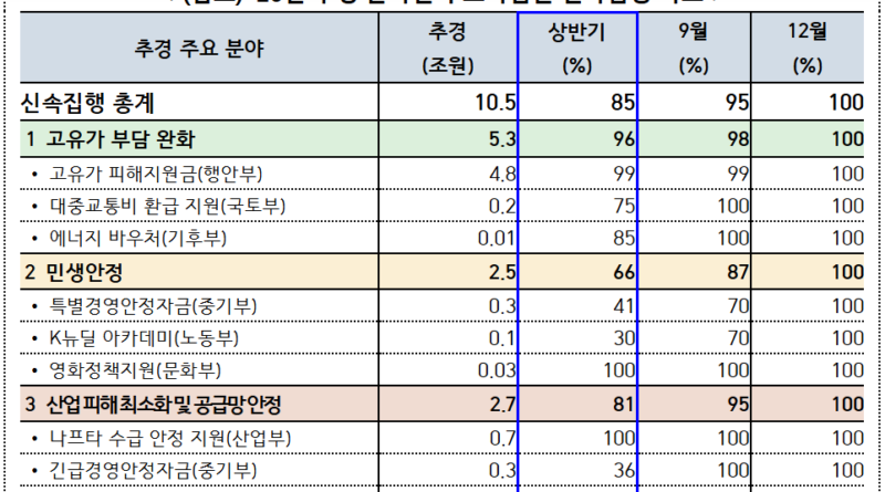 이번 조치는 2월 말 중동전쟁 이후 고유가와 물가 상승이 장기화되며 국민과 기업의 부담이 빠르게 확대된 데 따른 대응이다. 정부는 총 26조 2천억 원 규모의 추경 가운데 실질적인 집행 효과가 있는 25조 원을 관리 대상으로 설정하고, 이 중 10조 5천억 원 규모 사업에 대해서는 상반기 내 85% 이상 집행한다는 계획을 세웠다.