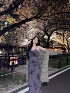 헤어 스타일 역시 눈길을 끌었다. 길게 늘어뜨린 웨이브 헤어는 복고적인 감성을 더하는 동시에 전체적인 분위기를 한층 부드럽게 만들었다. 벚꽃 조명 아래에서 포즈를 취한 컷뿐 아니라, 일본 거리 한복판에서 가디건 자락을 펼치거나 눈을 감고 미소 짓는 클로즈업 장면 등 다양한 연출이 담겨 있어 사진마다 서로 다른 매력을 드러냈다.