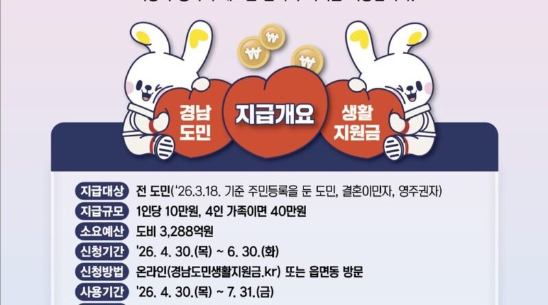 하동군은 군민 생활 안정과 지역경제 활성화를 위해 전 군민을 대상으로 ‘경남도민 생활지원금’을 지급한다고 밝혔다.