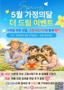 하동군이 5월 가정의 달을 맞아 4월 27일부터 5월 10일까지 ‘고향사랑기부 더 드림 이벤트’를 진행한다.