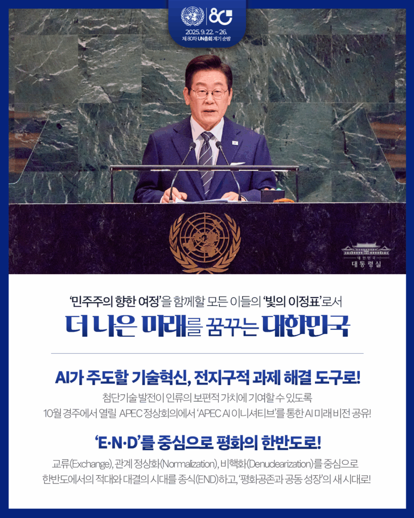이날 이 대통령은 제80차 유엔총회 기조연설을 통해 민주 대한민국의 국제사회 복귀와 다자주의적 협력, 글로벌 책임국으로서의 역할을 천명했다. 특히 한반도 평화공존과 공동성장을 위한 ‘END 이니셔티브(Exchange·Normalization·Denuclearization)’를 제시해 세계 정상들에게 메시지를 전달했다. 구테레시 UN 사무총장은 이 이니셔티브에 공감을 표하며 한반도의 안정과 평화 기여를 기대한다고 밝혔다.