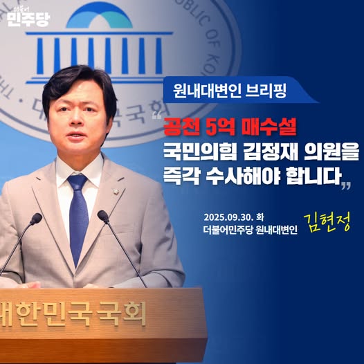 한편 김현정 민주당 원내대변인은 같은 날 기자회견을 열고 “호남 산불 망언으로 국민적 공분을 산 김정재 국민의힘 의원이 공천 매수 의혹의 중심에 섰다”며 즉각적인 수사를 촉구했다. 김 대변인은 “김 의원은 이철규 당시 공천관리위원장과의 통화에서 ‘웬만하면 단수로 해 달라’고 요청한 데 이어 ‘포항 지역구는 3~5억 원의 금전이 오간다’고 스스로 말한 사실이 드러났다”며 “이는 돈으로 공천을 사고파는 정치 부패의 전형이자 국민 신뢰를 배신한 행위”라고 비판했다.