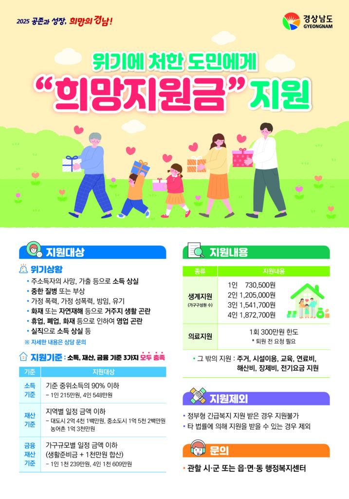 희망지원금은 올해 처음 경남도가 현행 법·제도에서 제외된 저소득 가구 중 위기상황에 처한 가구에 생계비, 의료비 등을 지원받을 수 있도록 도입한 경남형 긴급복지 제도이다.