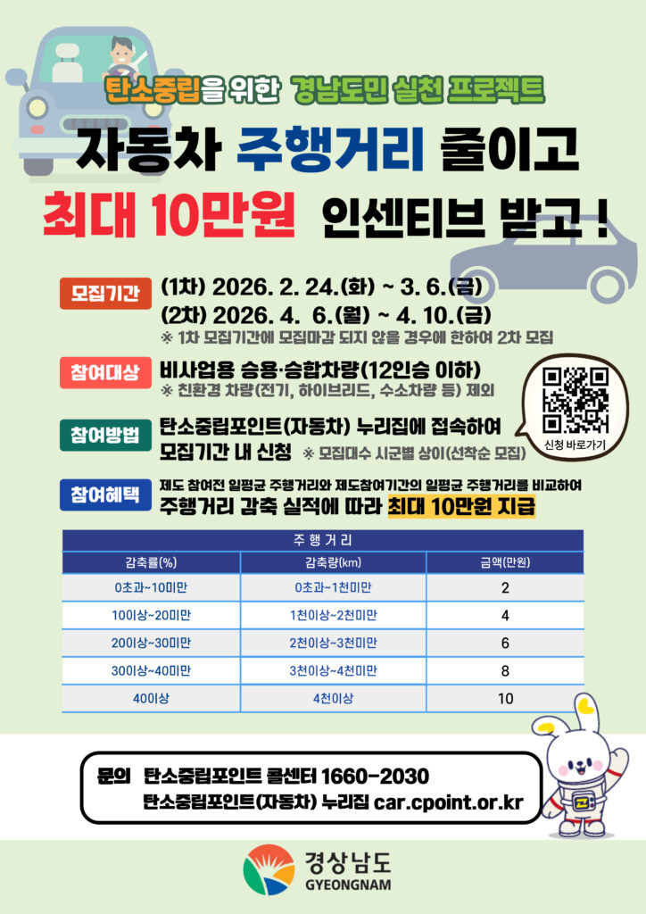 경상남도는 2월 24일부터 3월 6일까지 자동차 주행거리 감축 실적에 따라 최대 10만 원의 인센티브를 지급하는 ‘자동차 탄소중립포인트제’ 참여자를 모집한다고 밝혔다.