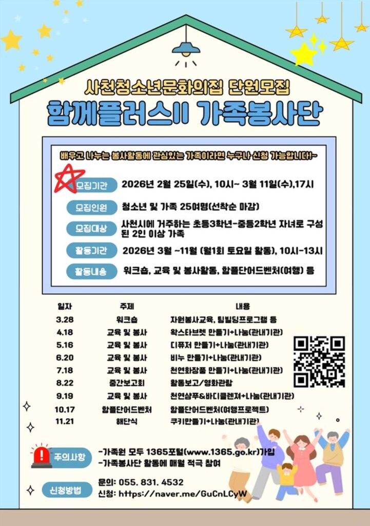 사천시 복지·청소년재단(대표이사 박재령) 사천청소년문화의집이 가족과 함께 이웃 사랑을 실천하고 건강한 가정 문화를 만들어갈 ‘2026년 함께플러스Ⅱ 가족봉사단’ 단원을 모집한다.