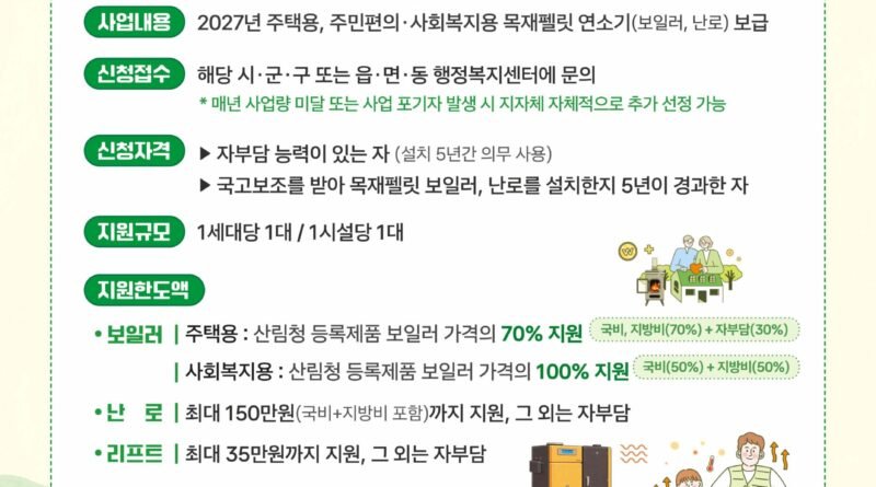 산림청이 친환경 난방 확대를 위한 ‘2027년도 목재펠릿 보일러·난로 보급 지원사업’ 신청 접수를 시작했다. 이번 사업은 겨울철 난방 수요에 선제적으로 대응하고, 화석연료 의존도를 낮추기 위한 정책의 일환으로 추진된다.