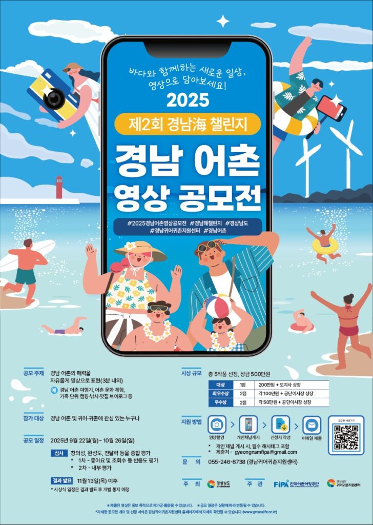 접수 기간은 9월 22일부터 10월 26일까지다. 국민 누구나 참여할 수 있고, ‘경남 바다와 어촌의 일상’을 주제로 3분 이내의 영상을 제작해 경남귀어취존지원센터 이메일(gyongnamfipa@gmail.com)로 제출하면 된다. 영상에는 바다 풍경은 물론 어촌 주민들의 소소한 일상, 전통어업과 체험 현장, 지역만의 독특한 문화 등을 담아야 한다.