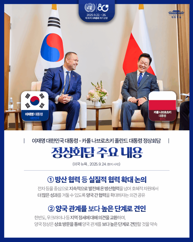 이어 카롤 나브로츠키 폴란드 대통령과의 회담에서는 국방·방산 협력이 주요 의제로 논의됐다. 폴란드 대통령은 K2 전차 납품 일정 준수를 높이 평가했으며, 이 대통령은 한국 무기의 품질과 가성비를 강조하며 추가 방산 협력을 제안했다. 폴란드 측은 한국 방위산업의 경쟁력을 인정하며 협력 확대에 뜻을 모았다.